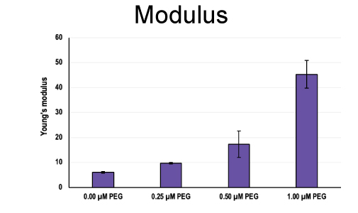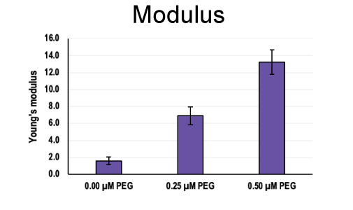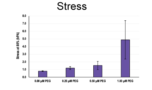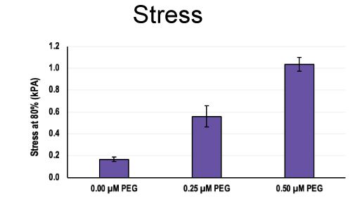 The mechanical properties of our 3D-printed materials can be further enhanced by photo-crosslinking, chemical crosslinking, or combination with fibrillar collagen. For instance, 4-arm polyethylene glycol (PEG), a non-cytotoxic FDA-approved crosslinker, can be combined with solubilized ECM to effectively tune mechanical properties as shown below. This biofabrication strategy can be used to recreate stiffnesses similar to a tissue of interest or study the effects of defined mechanical properties on cell function.